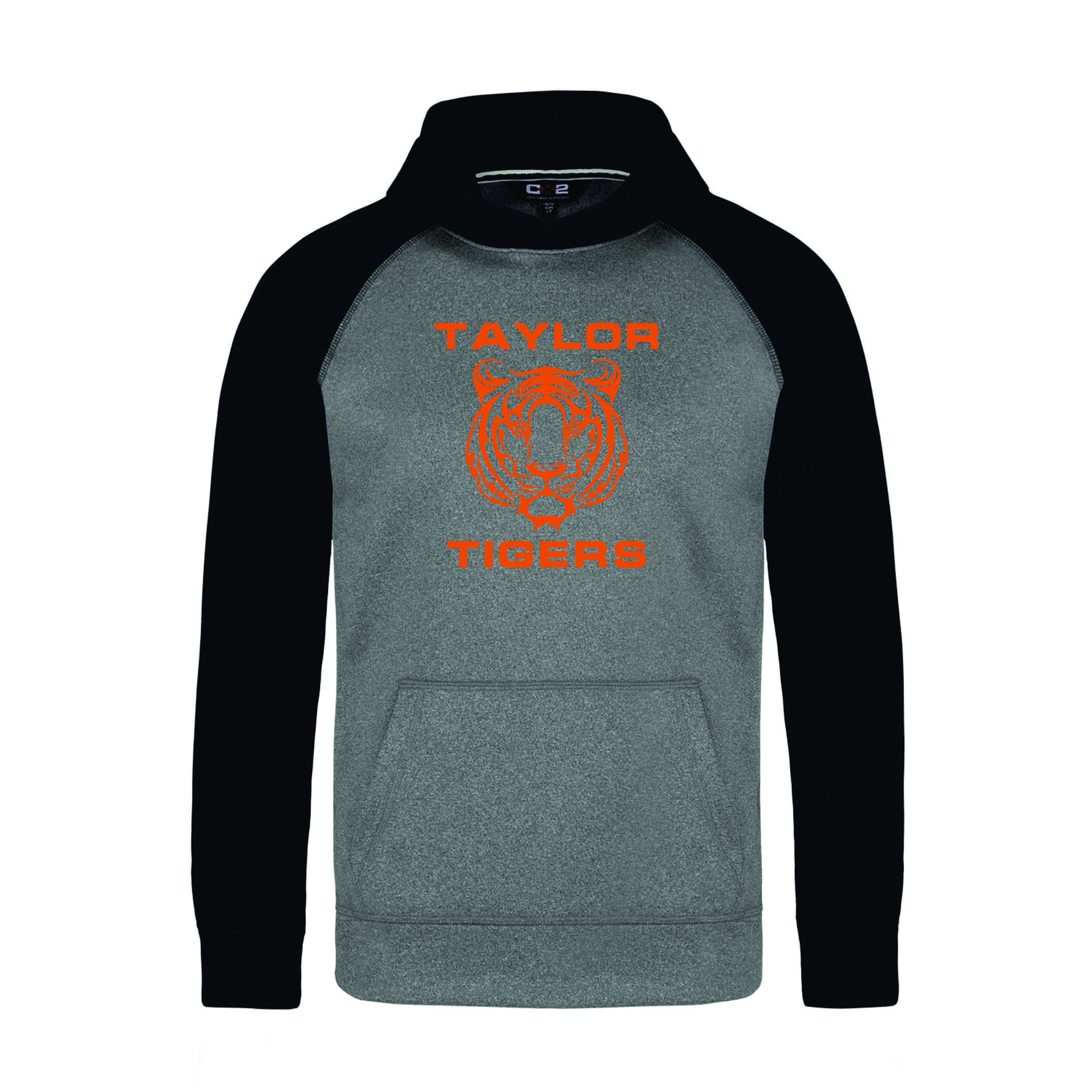 • Grey Hoody w Black Arms, Youth sizes. With full chest Taylor Tigers logo in orange