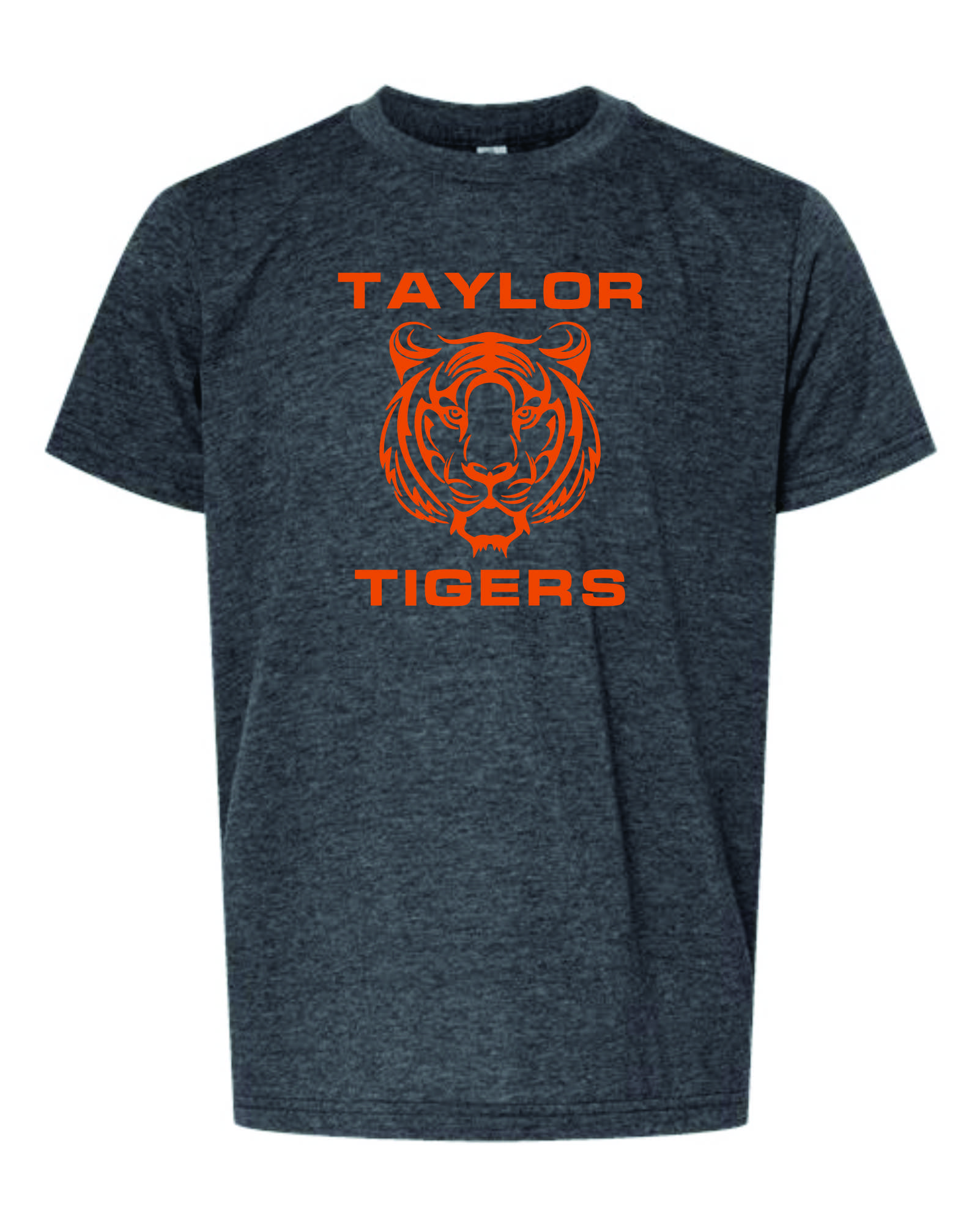 - Heathered Charcoal Grey T with full chest Taylor Tigers logo in orange